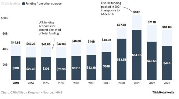 Figure 1 Total global health funding and funding from other countries except the United States from 2013 – 2023.3
